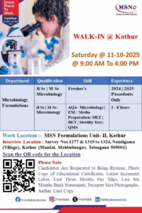 Pharma Walk in Drives – MSN, Aspiro, Apitoria, Finecure, Avantika, Natco, Sanolet & APDM Hiring Freshers & Experienced Professionals