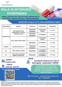 Join major Pharma walk-in interviews. Hiring for R&D, QC, QA, Production & Pharmacovigilance at Parexel, SynSmart, Neuland Labs & more....