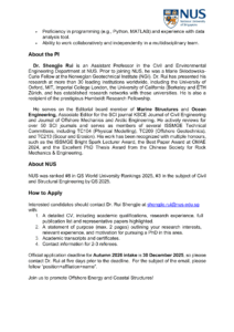 • Supervision and Research Environment: The selected students will be supervised by Dr. Shengjie Rui, an Assistant Professor in the Department of Civil and Environmental Engineering at NUS. Dr. Rui is an internationally recognized expert in offshore geotechnics, foundation engineering, and coastal structure dynamics, with a strong track record of high-impact publications and extensive collaboration with leading academic institutions and industry partners globally. The supervision style emphasizes developing independent research capabilities, critical thinking, and advanced technical skills in the students. The research lab provides a highly collaborative, international, and stimulating environment, with access to world-class laboratory facilities, advanced computational resources, and a strong network of academic and industry collaborators.