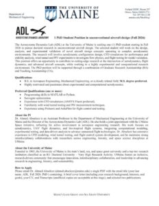The Aerosystems Dynamics Lab (ADL) in the Department of Mechanical Engineering at the University of Maine is recruiting for a PhD position starting in Fall 2026.
