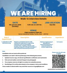 Cipla is hiring for its Goa site, focusing on OSD manufacturing operations.