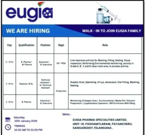 Eugia Pharma Specialties Limited is hiring for its Production and IPQA departments across two different recruitment formats (WhatsApp application and Walk-in).