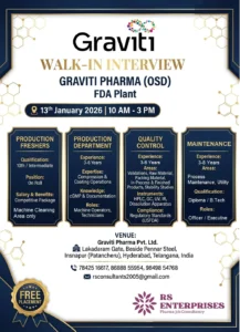 Graviti Pharma, a USFDA-approved OSD plant, is hosting a walk-in for both freshers and experienced candidates.