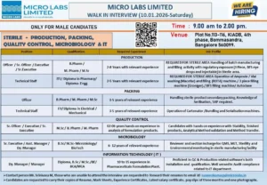 Micro Labs is a household name in the Indian pharma sector. Their Bommasandra plant is hiring male candidates for various specialized roles in sterile manufacturing and IT.
