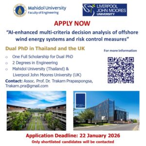Application deadline – 22 January 2026: Send CV, Transcripts, English test certificate and statement of purpose to Assoc. Prof. Dr. Trakarn Prapaspongsa (trakarn.pra@gmail.com)