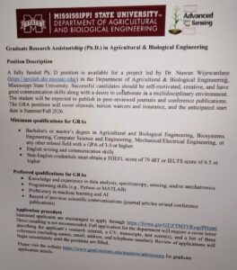 The intersection of technology and agriculture is one of the most vital sectors for global food security. Mississippi State University (MSU) is offering a Graduate Research Assistant (GRA) position within the Department of Agricultural and Biological Engineering for the Summer or Fall of 2026. This position, overseen by Dr. Nuwan Wijewardane, is ideal for students with a passion for mechatronics and sensing technologies.