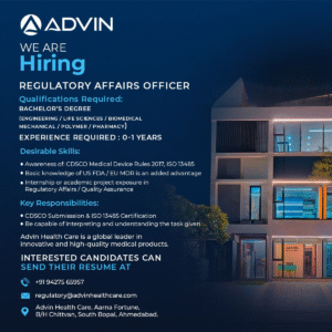 Advin Health Care is a global leader in the medical device industry. They are looking for fresh talent to join their team in Ahmedabad to navigate the complex world of medical device regulations.