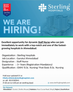 | Sterling Hospitals | Staff Nurse | ₹2.4 – 4.0 (Based on Exp) | Ahmedabad |