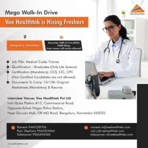 VEE HealthTek is a global leader in healthcare professional services. For December 2025, they have announced a specialized walk-in drive for Medical Coder Trainees. Medical coding is a critical part of the healthcare ecosystem, translating medical procedures into universal alphanumeric codes for insurance and documentation purposes.