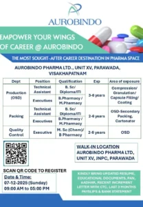 Aurobindo Pharma – Walk-In Interviews for Multiple Pharma Positions