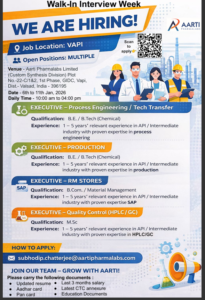 Aarti Pharmalabs, a cornerstone of the Aarti Group, is inviting specialists for its Vapi facility in Gujarat. This drive targets the mid-level professional bracket with 1 to 5 years of experience.