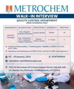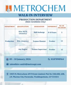 Metrochem API is hiring for 50 specialized positions at its J.N. Pharma City facility. This is one of the largest single-unit hiring drives this month in Andhra Pradesh.