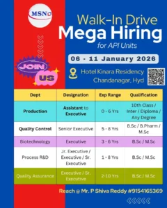 MSN Labs is organizing a “Mega Walk-In” at Hotel Kinara Grand, Hyderabad. This is arguably the most diverse drive of the month, covering nearly every functional area of an API plant.