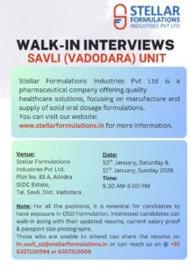 Stellar Formulations is hiring for its OSD (Oral Solid Dosage) unit in Vadodara.