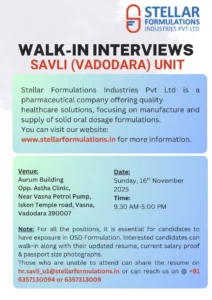 Stellar Formulations Industries Pvt. Ltd., Savli (Vadodara Unit), is hiring for multiple OSD Formulation positions across Quality, Production, Research, and Engineering departments.