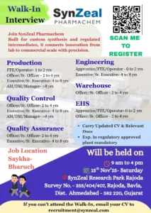 2) SynZeal Pharma – Walk In Interview for Production / QC / QA / EHS / Warehouse / Engineering