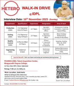 Hetero Labs is conducting a major walk-in recruitment for its OSD division in Jadcherla. The company is looking for candidates from production, packing, QC, and engineering backgrounds.