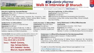 Ajanta Pharma, recognized as a “Great Place to Work,” is inviting professionals to join its specialty formulation facility. The company offers excellent amenities, including AC bus facilities for employees from Bharuch and Vadodara.