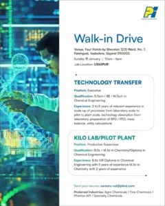 Technology Transfer Executive: B.Tech/M.Tech Chemical Engineering with 2–8 years in process scale-up and mass balance calculations.