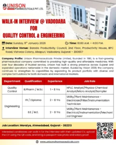 Unison Pharmaceuticals is hiring for its Moraiya (Ahmedabad) plant, with the interview taking place in Vadodara.