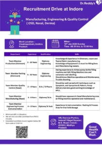Dr. Reddy’s remains a top-tier destination for pharmaceutical professionals. This recruitment drive held in Indore is specifically for their facilities in Visakhapatnam, Andhra Pradesh.