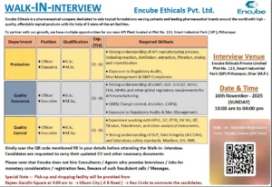 November 2025 brings an important series of pharmaceutical walk-in interviews across India, with leading companies such as Walter Bushnell Lifesciences, Aspiro Pharma, Encube Ethicals, Annora Pharma, and HETERO announcing large-scale recruitment for various manufacturing and quality roles. These opportunities span Production, Quality Assurance, Quality Control, Engineering, Packing, Warehouse, and several technical sub-functions.