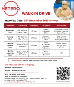 HETERO is conducting a walk-in interview for positions in OSD Production, Packing, Quality Control, and Quality Assurance at their facility located in Jadcherla. This walk-in is suitable for professionals with strong hands-on experience in OSD manufacturing operations.