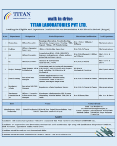 Titan Laboratories operates an EU-GMP and TGA-approved facility, providing candidates with international exposure. They are currently seeking male candidates for their plant in Mahad, Raigad.