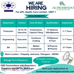 2) APL Health Care (Aurobindo) — Multiple Openings (Production / QA / Engineering)