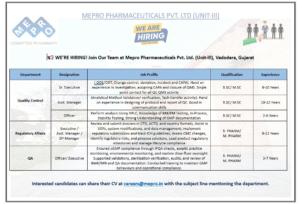 Mepro is scaling its QC, QA and Regulatory teams and seeks mid to senior level professionals with WHO-GMP experience. Roles span laboratory leadership, method validation, regulatory dossier preparation, and QA oversight.