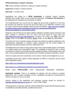 Univ. Oxford UK Organic Redox Catalysis admissions@ox.ac.uk