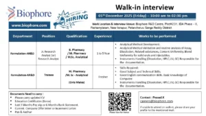 Biophore India conducts a professional walk-in for AR&D and R&D departments to recruit trainees and experienced analysts. The company has strong R&D capability with a focus on formulation, analytical research and new product development.