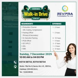 2) Rivpra Formulation – Walk-In Interviews for Production, Packing, QC, IPQA, ADL & DRA