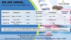 Ciron Drugs is expanding its tablet and capsule formulation plant at Palghar. They’re hiring professionals in Quality Control and Engineering, emphasizing HPLC testing and electrical maintenance.