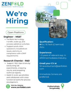 Zenfold Sustainable Technologies drives eco-friendly manufacturing in API and intermediates production. The company is recruiting MS&T Engineers and R&D Chemists.
