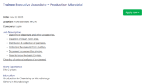 • Apply at Lupin’s careers portal; include resume, academic certificates, and a cover letter expressing interest in microbial production.