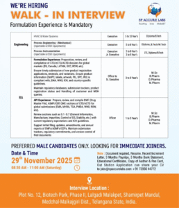 The last week of November 2025 presents an outstanding cluster of hiring events across the Indian pharmaceutical and biotech industry. Top and mid-sized companies are organizing walk-in drives targeting both freshers and experienced professionals across medical billing, QC, QA, production (microbial & injectable), R&D, EHS, warehouse, engineering, regulatory affairs, and maintenance roles.